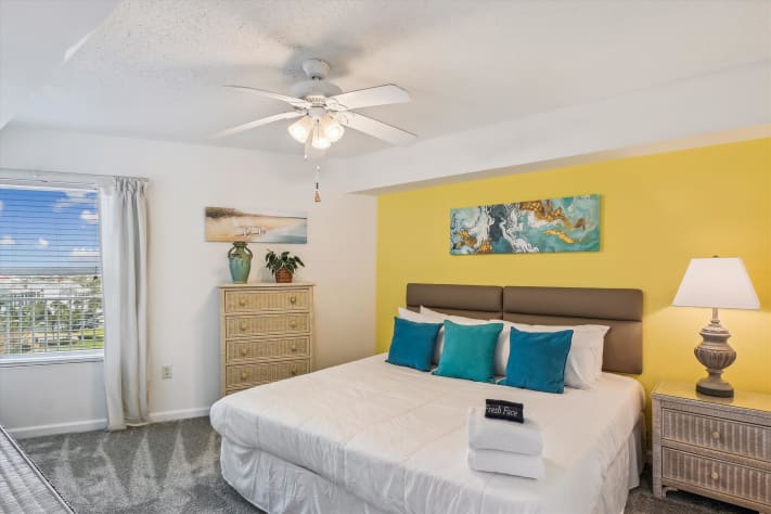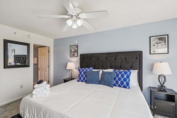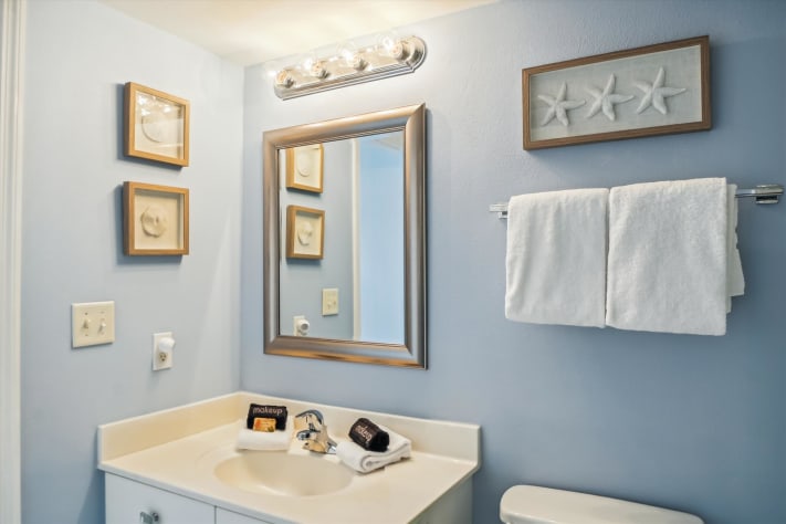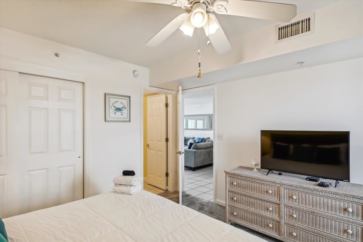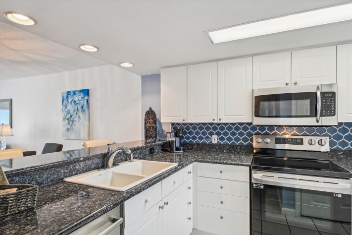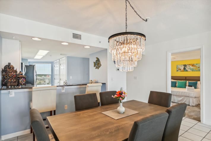 The kitchen is open and spacious. The full-sized appliances are all stainless steel and there is even a washer and dryer in this condo. All the pots, pans, and dining ware are provided so you can easily cook a meal before hitting the beach.