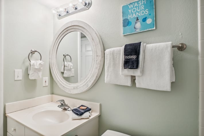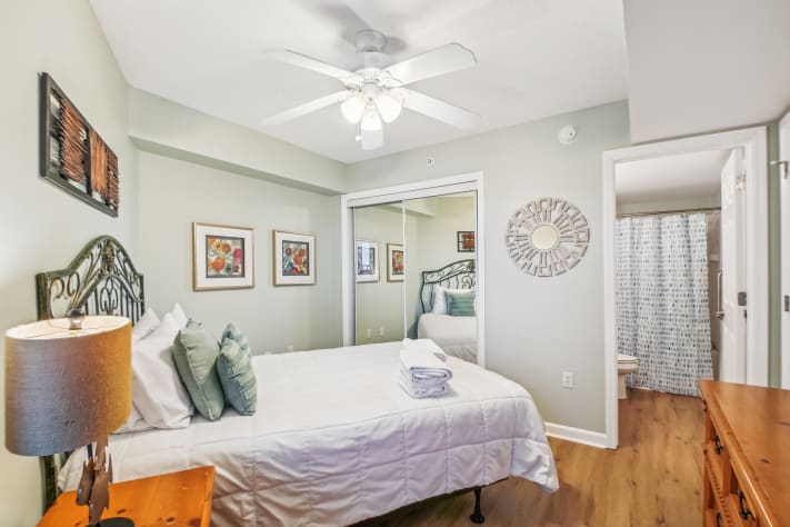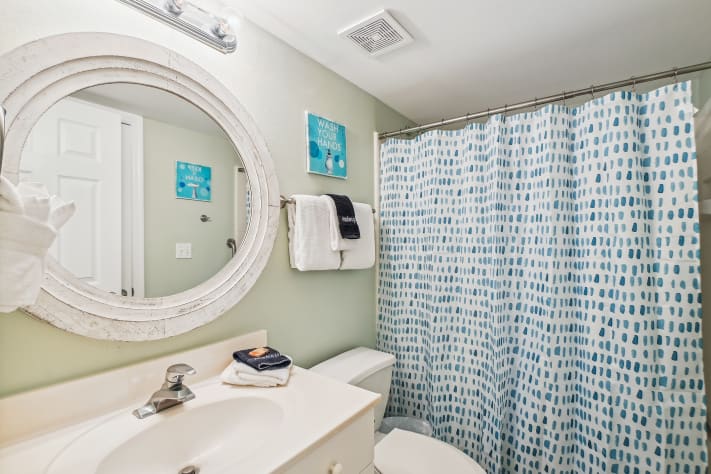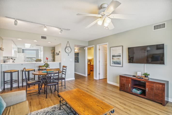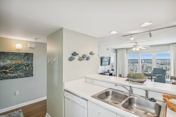 The living room offers plenty of comfortable seating options to enjoy the large flat screen TV. If you don’t want to watch TV, you are just steps away from the white sandy beaches. This condo features a king in the master bedroom, a queen in the guest bedroom, a queen in the private studio suite, and a sleeper sofa in the living room to comfortably sleep up to 6 guests. You will appreciate the convenience of the new stackable washer/dryer after a fun filled day of vacation adventures.