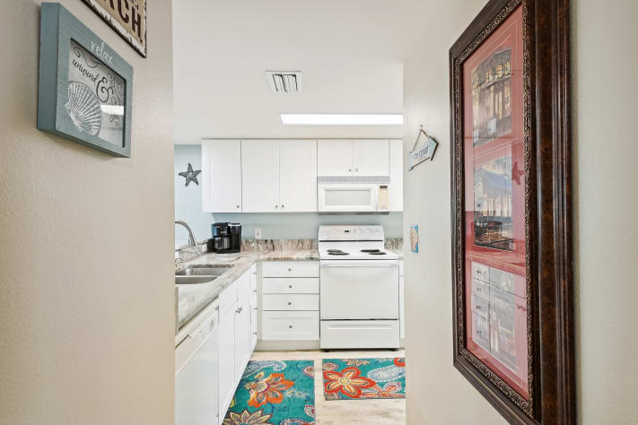 Step through the door and enter Seacrest 511, a 2 bedroom/2bath condo, located on beautiful Okaloosa Island. The kitchen is spacious and equipped with all full sized appliances. All the cookware, bakeware, and utensils needed are provided so you don’t have to bring the kitchen on vacation with you. The dining area is next to the kitchen so you can have a conversation with the family while cooking or eating. The dining area accommodates 4 with additional seating at the kitchen bar.