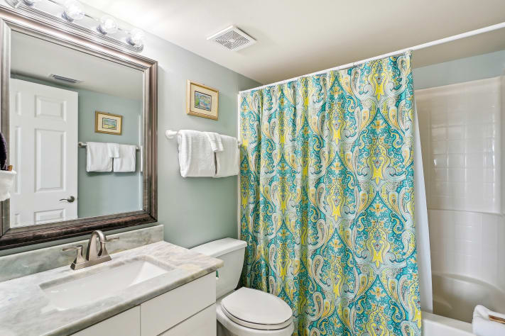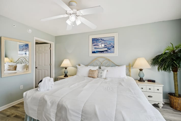 The living room offers plenty of comfortable seating options to enjoy the large flat screen TV. If you don’t want to watch TV, you are just steps away from the white sandy beaches. This condo features a king in the master bedroom, a queen in the guest bedroom, and a sleeper sofa in the living room to comfortably sleep up to 6 guests. You will appreciate the convenience of the new stackable washer/dryer after a fun filled day of vacation adventures.
