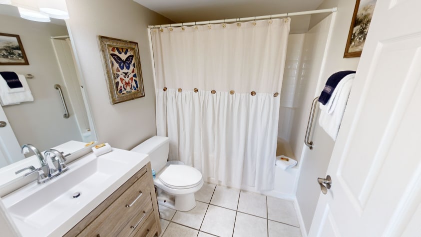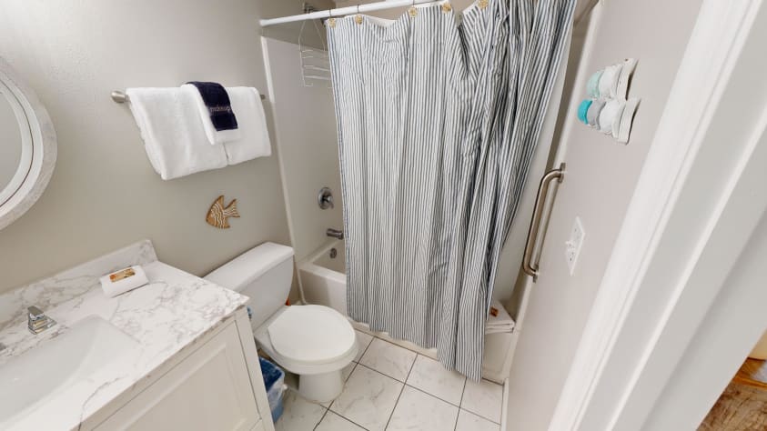 The Master bedroom has King sized bed, ceiling fan, and flat screen TV. The nightstands feature USB plug-ins to charge your devices after a day at the beach. There is even access to the private balcony of this unit from the bedroom. The master bathroom has a combination tub/shower.