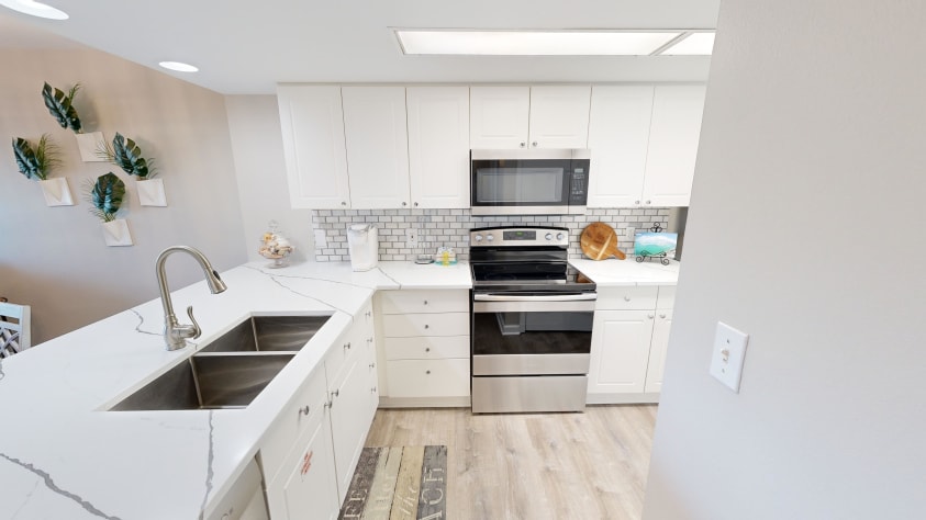When you open the door you’re greeted by the open floor plan of this coastal retreat. The kitchen is spacious and has the cookware, bakeware, and utensils you’ll need to cook a feast for the family. The owner has even supplied a crockpot, so you can have a warm ready to eat dinner after spending a day at either the indoor or outdoor pool. Adjacent to the kitchen is a washer and dryer so you don’t have to worry about packing your whole closet for your getaway.