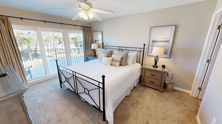 The Master bedroom features a King-sized bed and balcony access. The Master Bathroom has a vanity area and combination tub/shower.