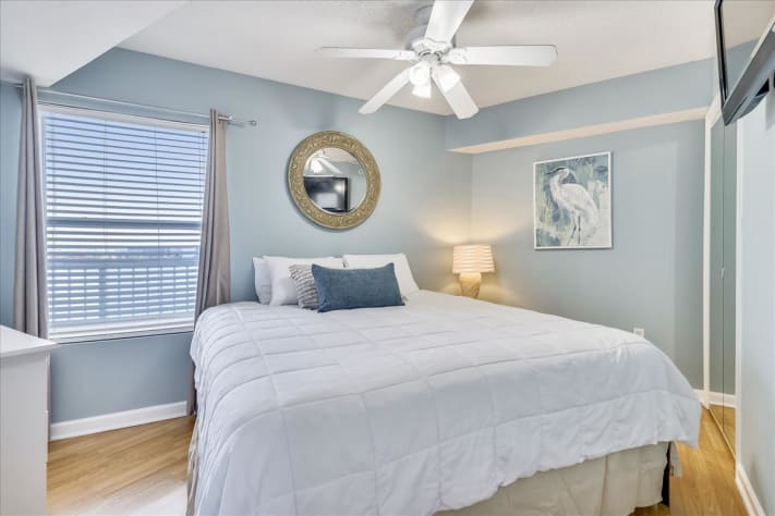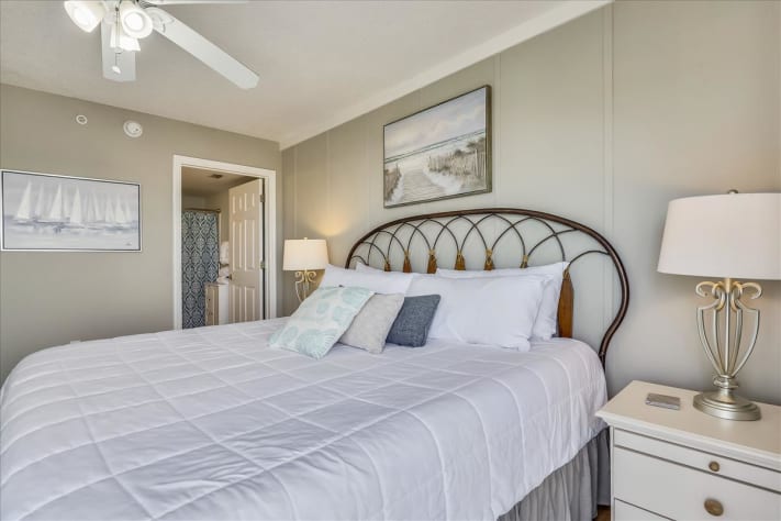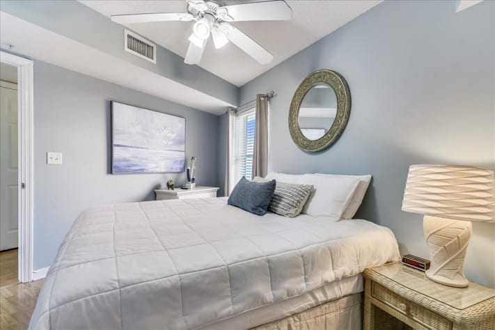 The guest bedroom has a King-sized bed, ceiling fan, and flat screen TV. The guest bathroom is accessible from the guest bedroom or living area. The Master Bedroom offers a King-sized bed, balcony access, a ceiling fan, and a Flat Screen TV. The private Master Bathroom is only accessible thru the Master Bedroom.