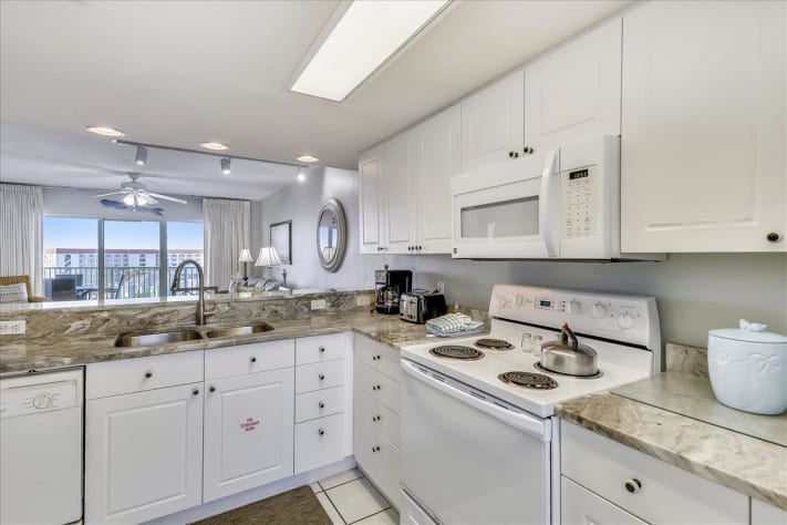 Step into Paradise, on Okaloosa Island, Seacrest 710. This gorgeous, 2 bedroom/2 bathroom is located on the 7th floor of Seacrest condominiums. When you walk into this unit you’re greeted by the spacious open living room, dining area, and the kitchen.