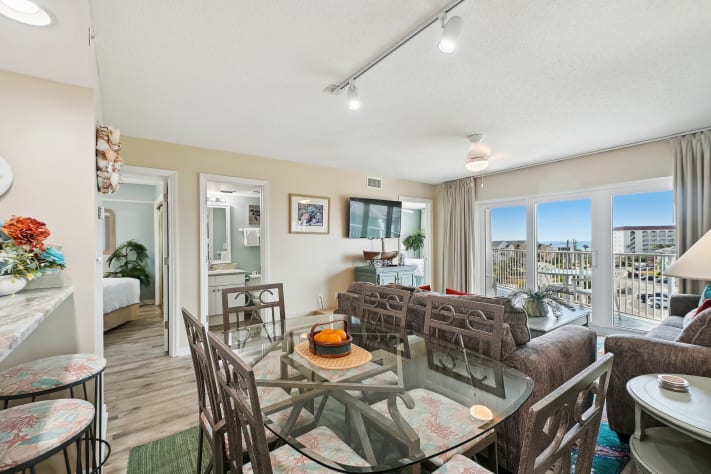 Step through the door and enter Seacrest 511, a 2 bedroom/2bath condo, located on beautiful Okaloosa Island. The kitchen is spacious and equipped with all full sized appliances. All the cookware, bakeware, and utensils needed are provided so you don’t have to bring the kitchen on vacation with you. The dining area is next to the kitchen so you can have a conversation with the family while cooking or eating. The dining area accommodates 4 with additional seating at the kitchen bar.